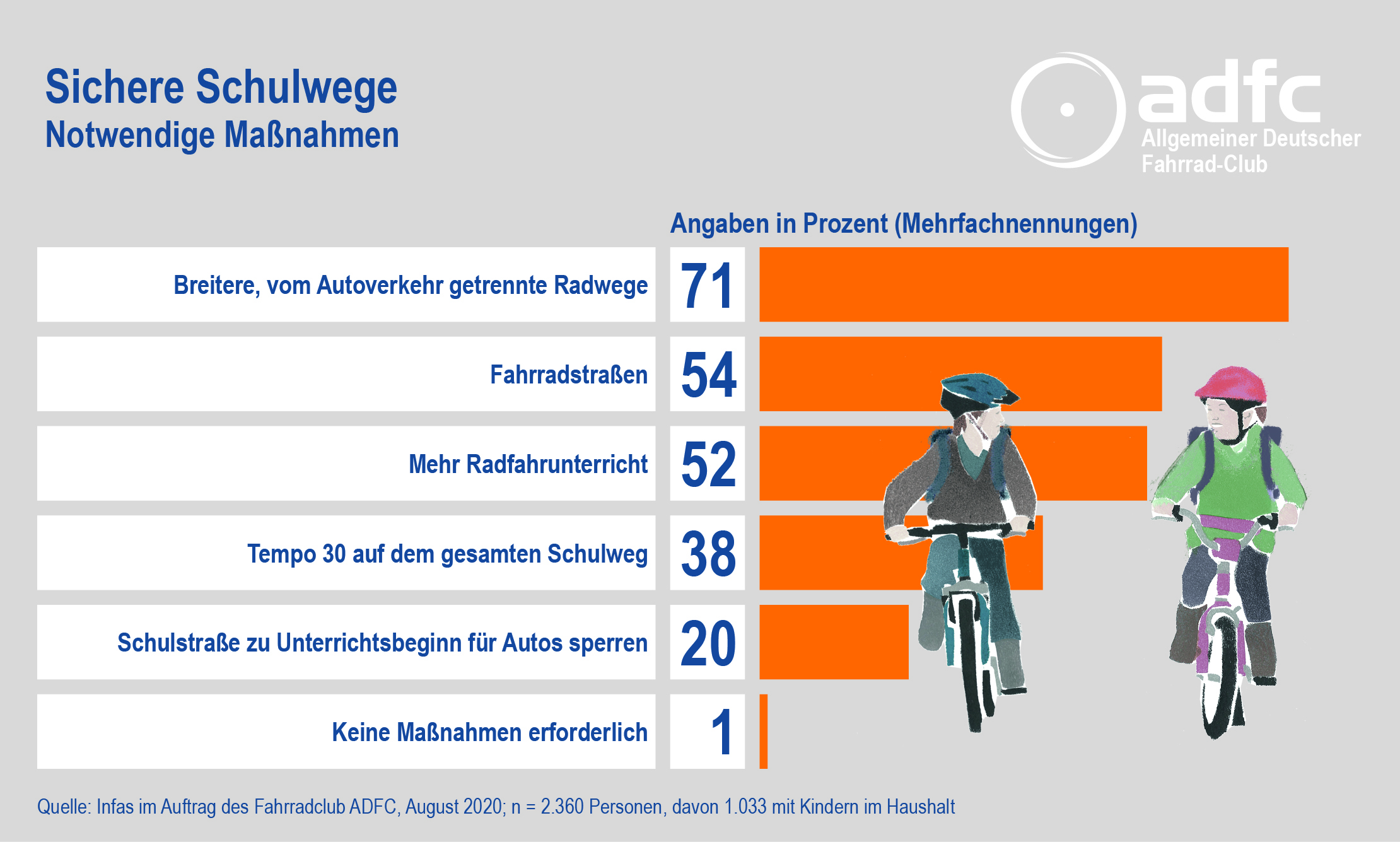 Nur 1 Prozent der Bevölkerung sagt, dass keine Maßnahmen ergriffen werden müssen, um das Radfahren zur Schule zu fördern. Die überwältigende Mehrheit der Bundesbürgerinnen und -bürger ist also der Meinung, dass etwas passieren muss. 71 Prozent finden, dass breitere und vom Autoverkehr getrennte Radwege helfen würden, mehr Schulkinder aufs Rad zu bringen. 54 Prozent sprechen sich für Fahrradstraßen aus, auf denen das Rad Vorrang vor dem Auto hat und höchstens Tempo 30 gefahren werden darf. 52 Prozent halten mehr Radfahrunterricht für sinnvoll. 38 Prozent halten Tempo 30 auf dem gesamten Schulweg für zielführend und 20 Prozent sprechen sich dafür aus, dass Schulstraßen zum Unterrichtsbeginn für den Autoverkehr gesperrt werden. Dieses Modell wird derzeit in Wien getestet.